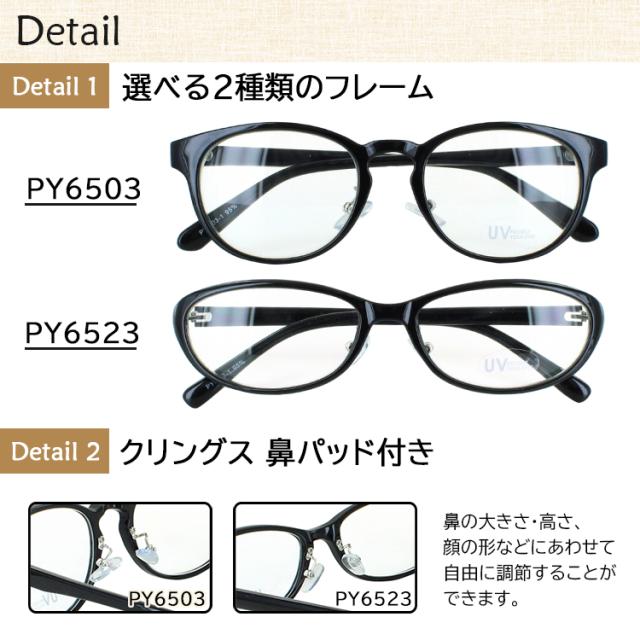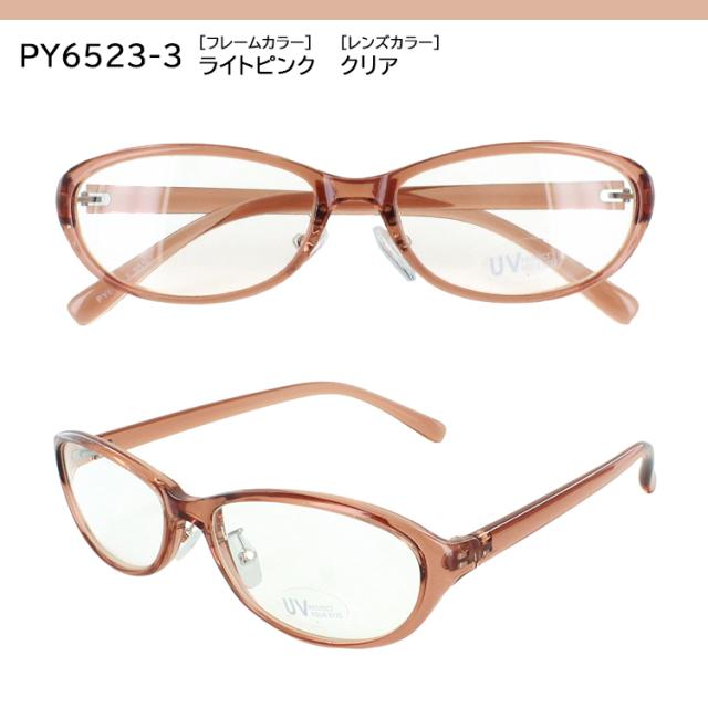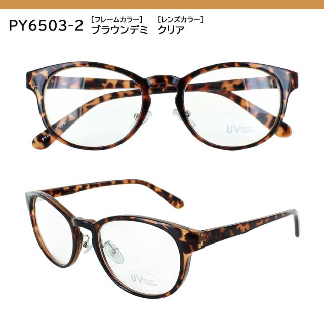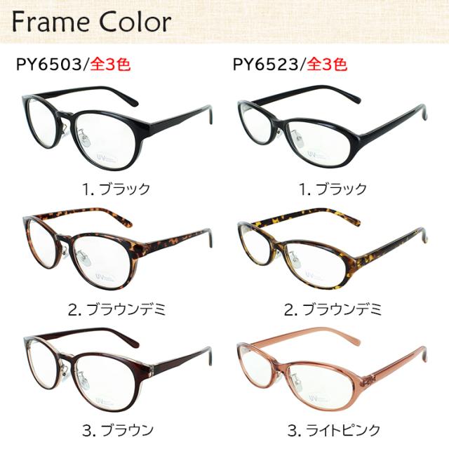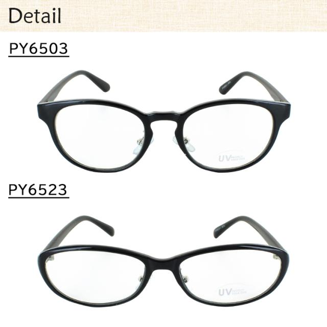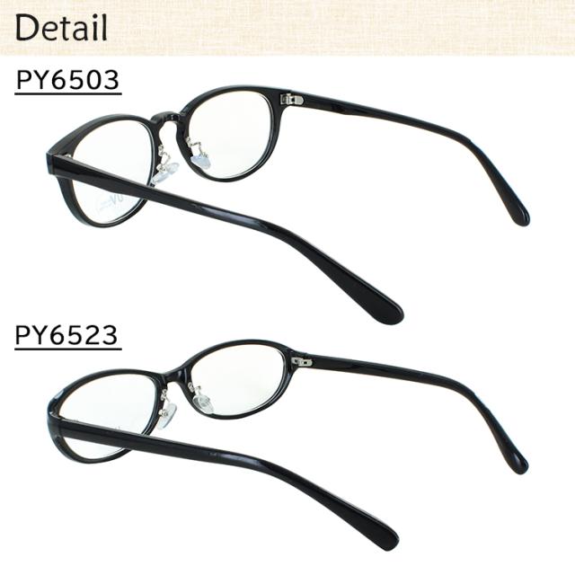 | ●フレームカラー PY6503-1 ブラック PY6503-2 ブラウンデミ PY6503-3 ブラウン PY6523-1 ブラック PY6523-2 ブラウン デミ PY6523-3 ライトピンク ●レンズカラー(全色共通) クリア | ●素材 フレーム:プラスチック(塗装) テンプル:プラスチック(塗装) レンズ:プラスチック(コーティング) ●仕様 UVカット99%以上 |
