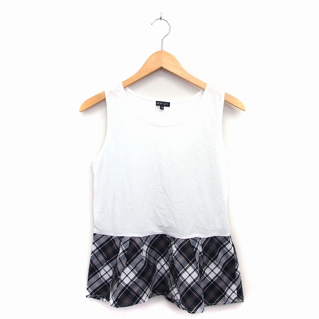 【中古】インディヴィ INDIVI カットソー 丸首 ノースリーブ 綿混 切替 無地 チェック 柄 ペプラム タック 38 白 灰