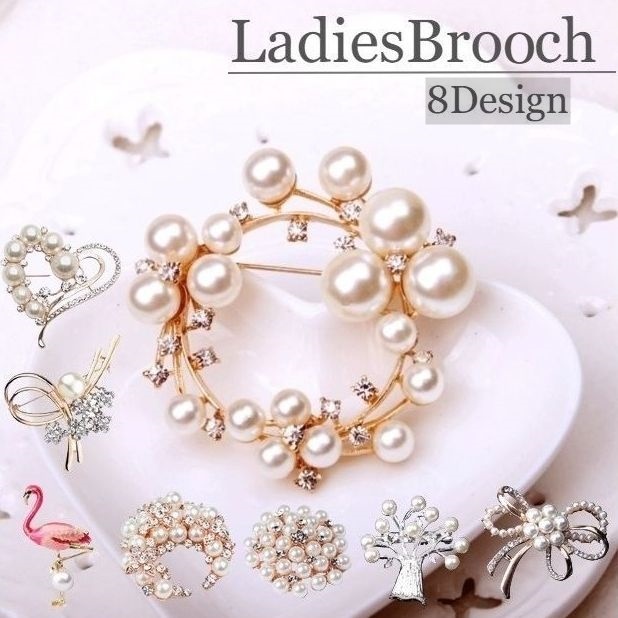 ラインストーンやフェイクパールの飾りが華やかなブローチ。