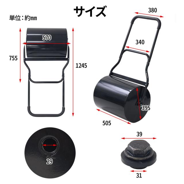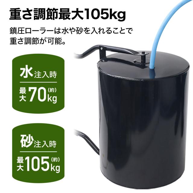 鎮圧ローラーは水や砂を入れることで最大約105kgまでの重さ調節が可能。