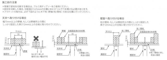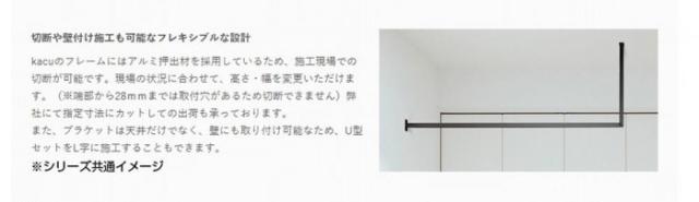 | 天井付け物干し「kacu」は、凹凸を極限まで無くした、シンプルな常設型物干しです。壁、柱、窓枠など、部屋を構成するものの多くは直線でできています。この物干しも直線。丸みのないデザインは、使っていないときにも部屋になじみます。本体がアルミ製のため、現場での切断が可能。また、天井から吊るすだけでなく、ブラケットを壁に取り付け、L字に施工することもできる、フレキシブルな設計です。 【注意事項】 ■施工上のご注意 ・組立部品・ねじはメーカー指定品を使用してください。 ・施工は必ず専門業者で行ってください。 ・天井への取付作業は2人以上で行ってください。 ・ブラケットの取付は、必ず木下地(野縁・柱・間柱)のある位置に行ってください。また、施工前に、木下地自体に十分な強度があることを確認してください。 ・L字ジョイント、T字ジョイントの組立・取付の際にインパクトドライバーを使用しないでください。 ■施工前の注意 ・現場で部材を切断する場合は、アルミ用チップソーをご使用ください。 ・部材を切断した場合、切断面から25mmの位置にΦ4.5ドリルで穴を開ける必要があります。 ・ブラケットの取付は、必ず下図のように木下地(野縁/柱/間柱)のある位置に行ってください。 ■使用上のご注意 ●製品の破損やケガの原因となりますので、以下の行為は絶対にしないでください。 ・1スパンあたり10kg以上の荷重をかける。 ・ぶら下がるなど、物干し以外の用途での使用。 ・メーカー指定の付属品以外のものを取り付ける。 ・分解、改造を行う。 ●頭をぶつけないように注意してください。 ●使用前に、各部がきちんと組み立てられているか確認してください。 ※沖縄県、離島は別途料金(中継料)かかかります。 |