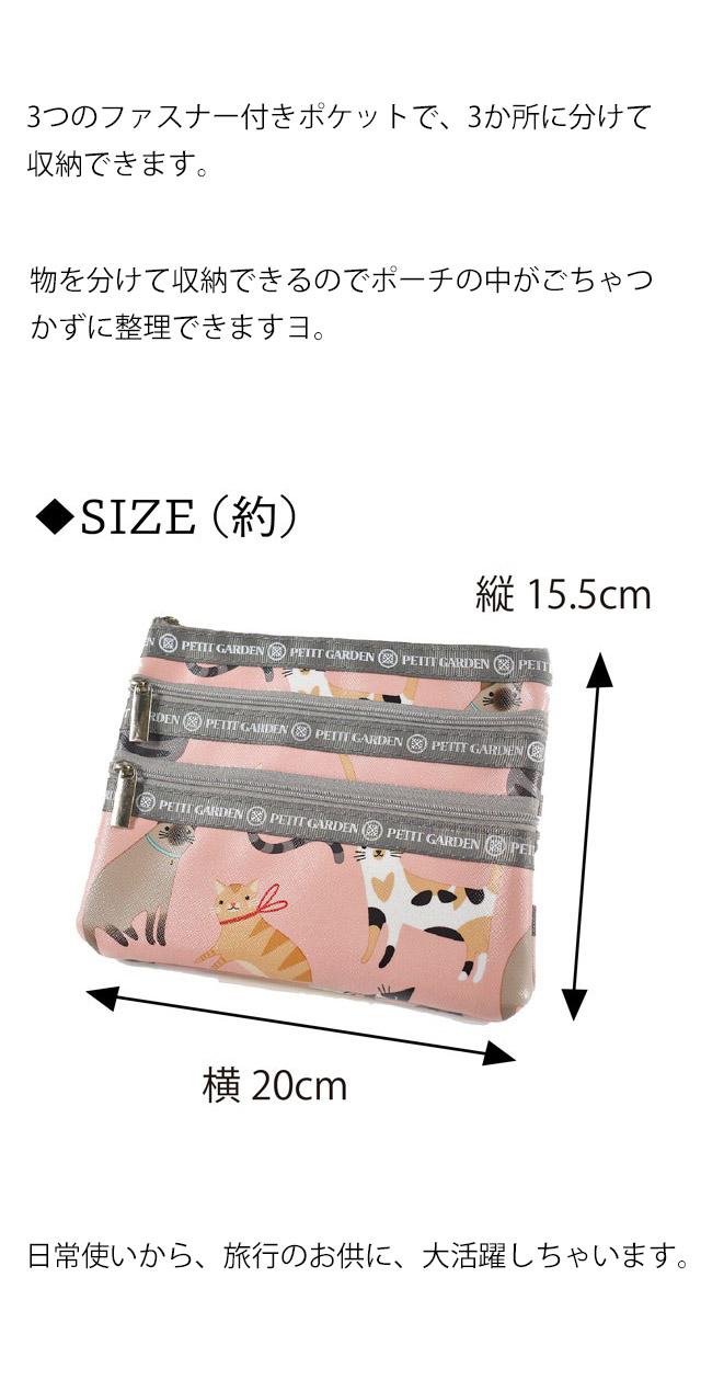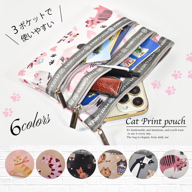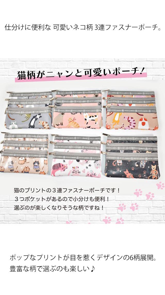 ポーチ 猫 化粧ポーチ カジュアル 猫柄トリプルジップ 3連ファスナー ネコ柄プリント 3段ファスナー