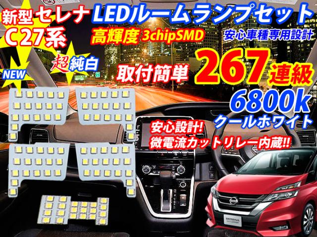 新型セレナ C27系 専用設計 LEDルームランプセット 267連級!! G/X/S、ハイウェイスター、ハイブリッド車対応、サンルーフ付車対応!! その他の車種 SUZUKI C27系ランディ (SGC27 SGN27)も全グレード対応可!!