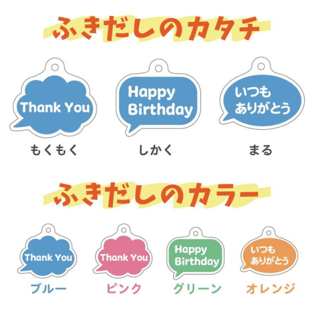 | 吹き出しのカタチにプリントされるから、 一言メッセージを入れると、お子さんがしゃべっている風に! お名前を入れて、ネームタグ 代わりにしても◎ 【 吹き出しのカタチ3種類 】 ・ もくもく ・ しかく ・ まる 【 選べるカラー4色 】 ・ ブルー ・ ピンク ・ グリーン ・ オレンジ お好きな色とデザインでカスタマイズできるから特別感UP! 自分だけのオリジナルキーホルダーを作りましょう♪ ※オプションのみでは注文いただけません。着ぐるみキッズキーホルダーと同梱にてご注文ください。オプションのみでご注文いただいた場合は、誠に勝手ながらキャンセルとさせていただきます。 |