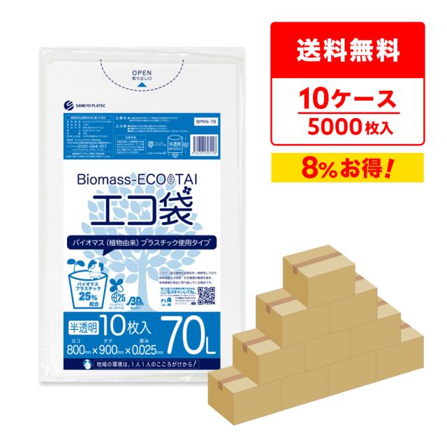 【まとめて10ケース】BPKN-78-10 バイオマスプラスチック25%配合エコ袋 70リットル 0.025mm厚 半透明 10枚x50冊x10箱 / ゴミ袋 ごみ袋 送料無料