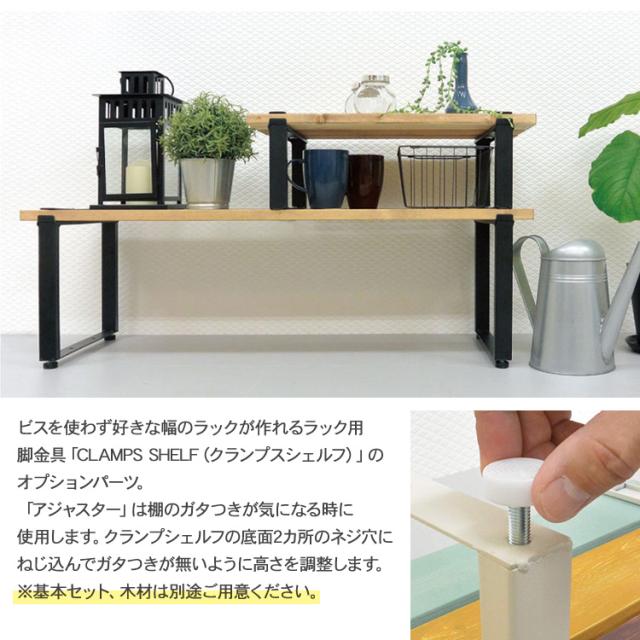 商品説明:ビスを使わず好きな幅のラックが作れるラック用脚金具「CLAMPS SHELF(クランプスシェルフ)」のオプションパーツ。