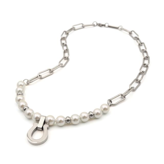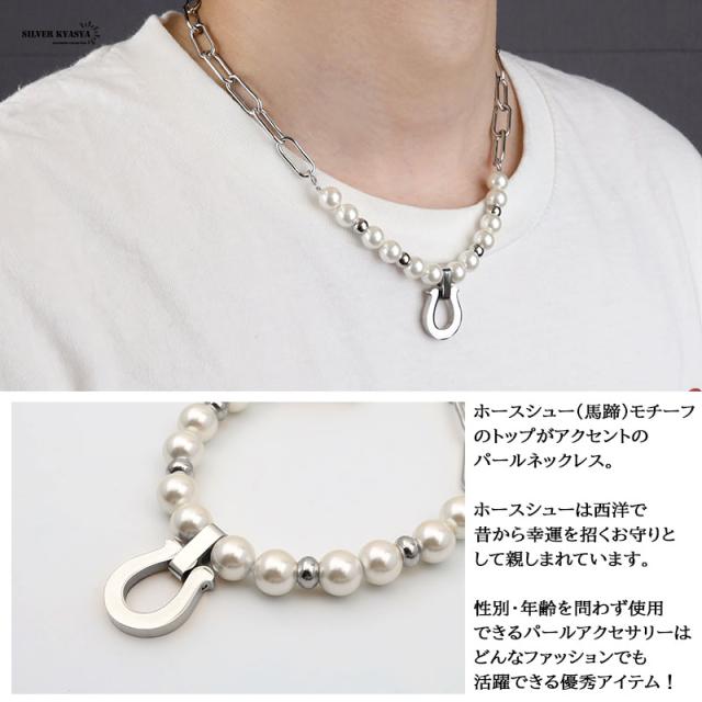 ホースシュー(馬蹄)モチーフのトップがアクセントのパールネックレスです。