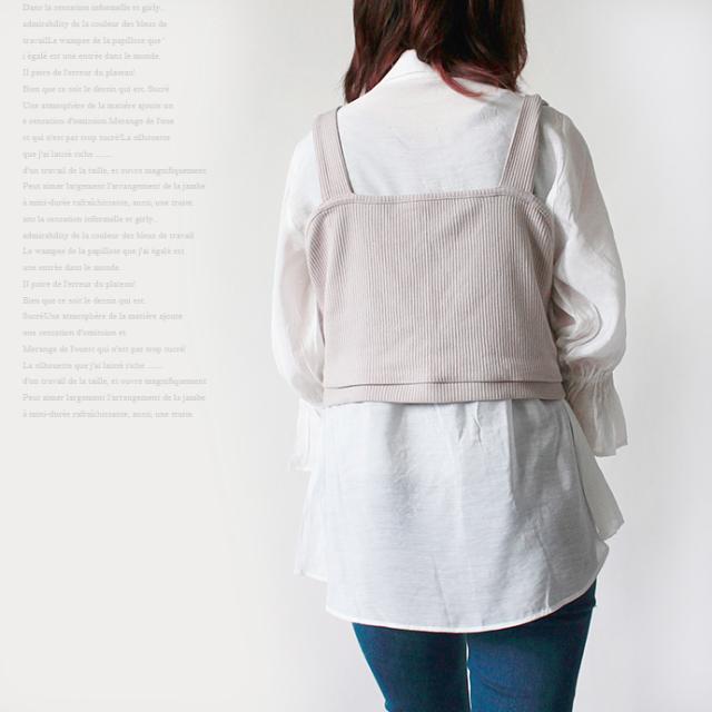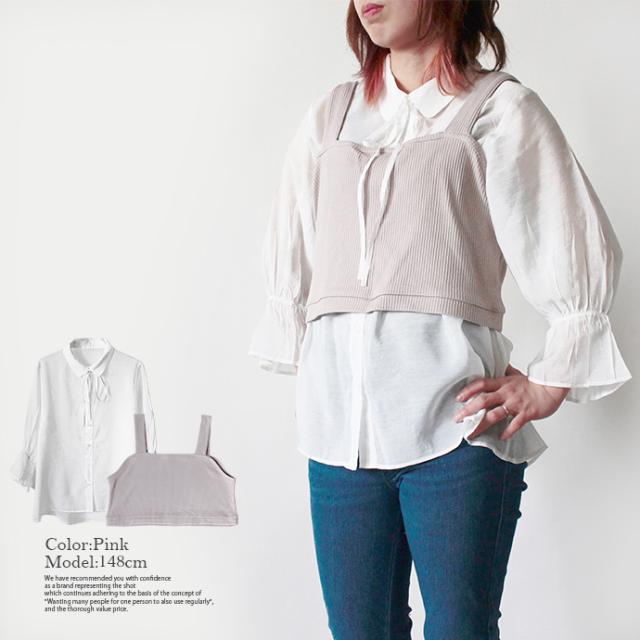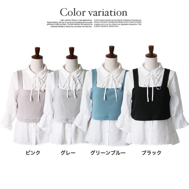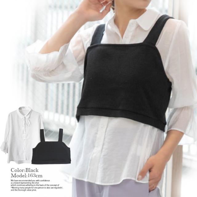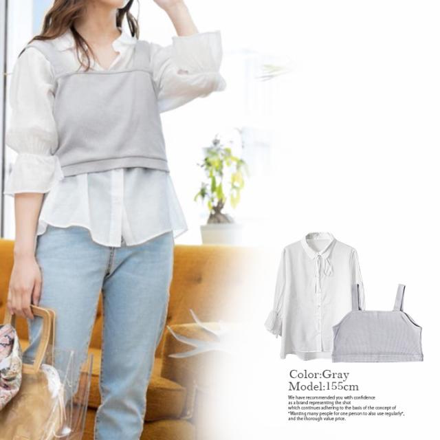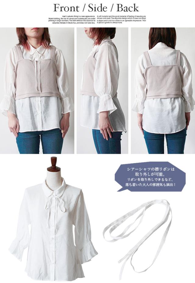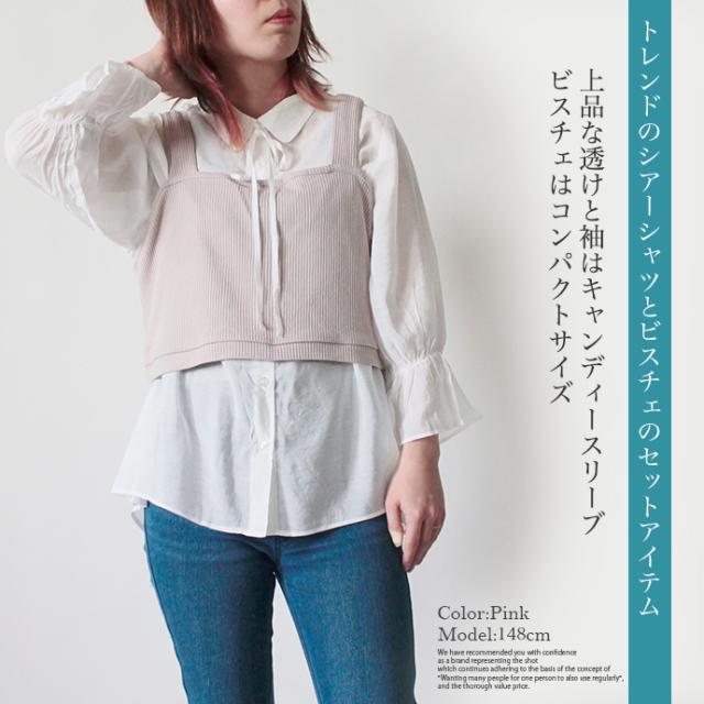 レディース トップス 2点セット シャツ ビスチェ シアーシャツ ニットビスチェ アンサンブル パフスリーブ キャンディースリーブ 長袖 リボン 重ね着 (メ)