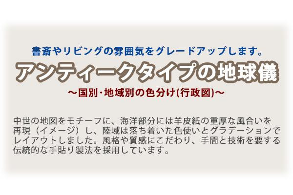 | 中世の地図をモチーフに、落ち着いた色使いとグラデーションでレイアウトしたアンティーク風の地球儀です。十分な実用性とインテリア性を兼ね備えたエントリーモデルです。アンティーク風の球体、メタリックシルバー色のホルダー、つや消しブラックの台座で構成されています。 |