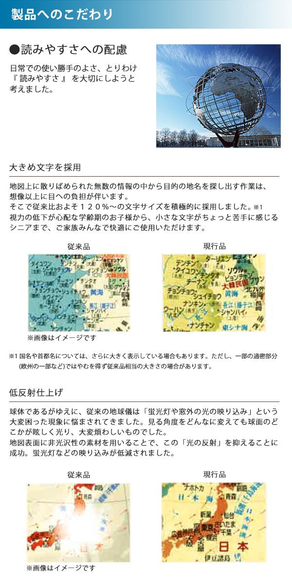 中世の地図をモチーフに、落ち着いた色使いとグラデーションでレイアウトしたアンティーク風の地球儀です。十分な実用性とインテリア性を兼ね備えたエントリーモデルです。アンティーク風の球体、メタリックシルバー色のホルダー、つや消しブラックの台座で構成されています。 |