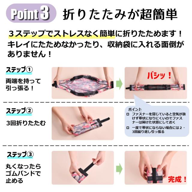 3ステップでストレスなく簡単に折りたためます!キレイにたためなかったり、収納袋に入れる面倒がありません!