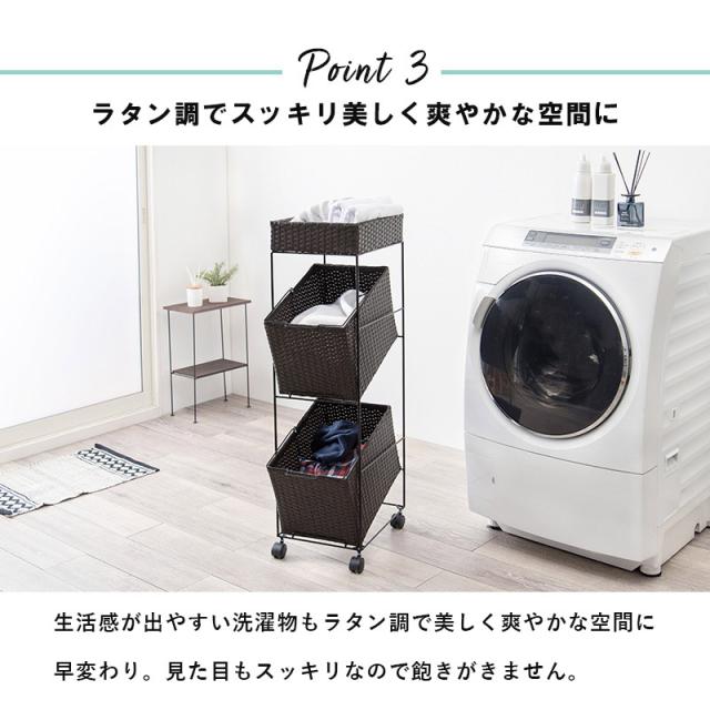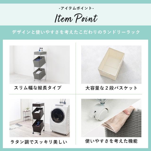 ランドリーラック バスケット付き 大容量 2段バスケット 幅28cm スリムタイプ 分別洗濯物ラック かご2個付き キャスター付き おしゃれなラタン調 ホワイト ダークブラウン グレー 代引不可