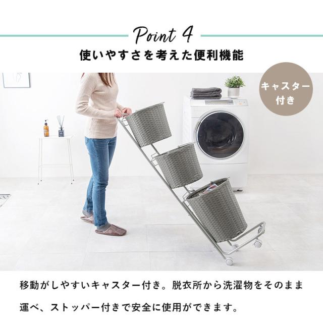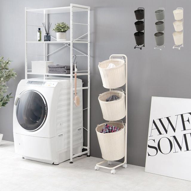 ランドリーラック バスケット付き 大容量 丸形 3段バスケット 幅36.5cm スリムタイプ 分別洗濯物ラック かご2個付き おしゃれなラタン調 WH DBR GY 代引不可