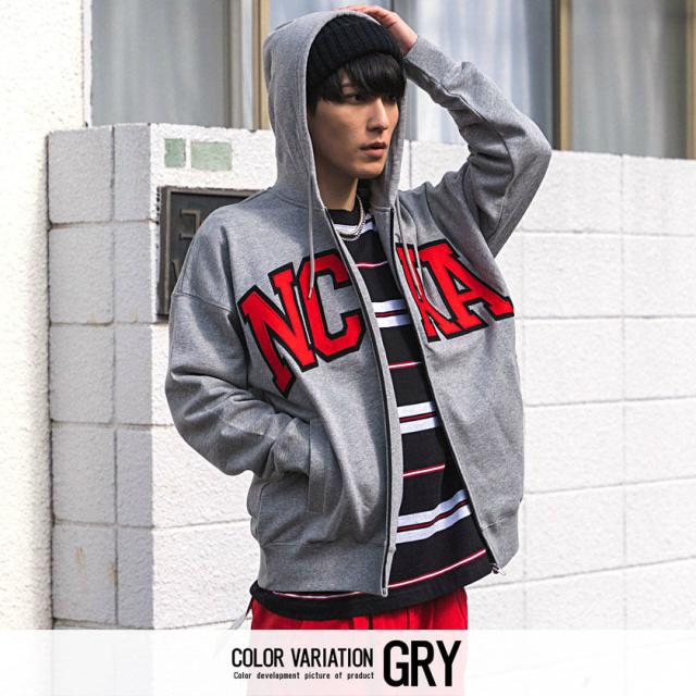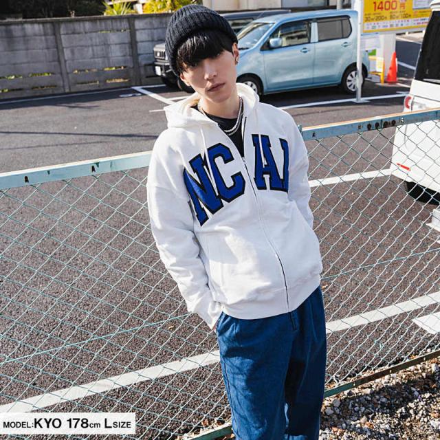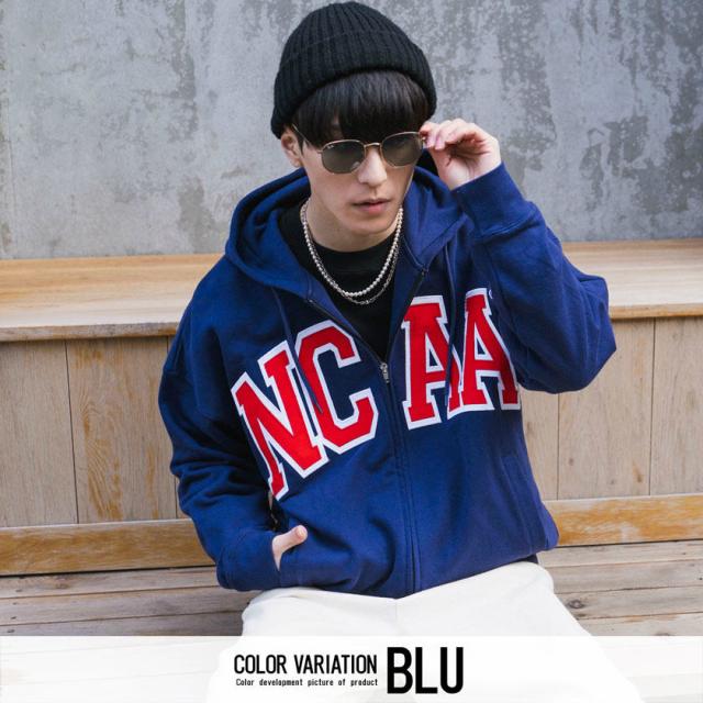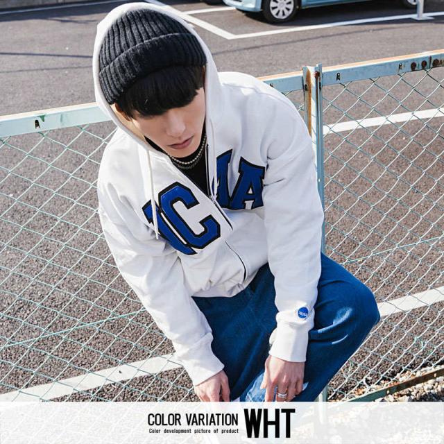 パーカー メンズ 長袖 トップス スウェット スエット 裏毛 ジップアップ 90s 90年代 カレッジロゴ 刺繍 ワッペン ユニセックス ブランド ホワイト ブラック 白 黒 M L XL アメカジ カジュアル ストリート 韓国 NCAA エヌシーエーエー 春 即日発送 [KM0131]