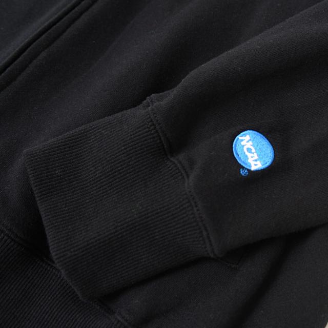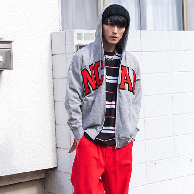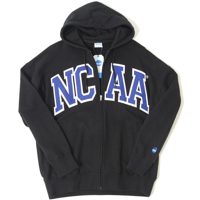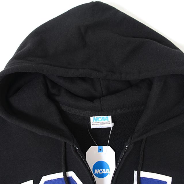 フロントに大きくNCAAのワッペンロゴ刺繍を施したジップパーカー。