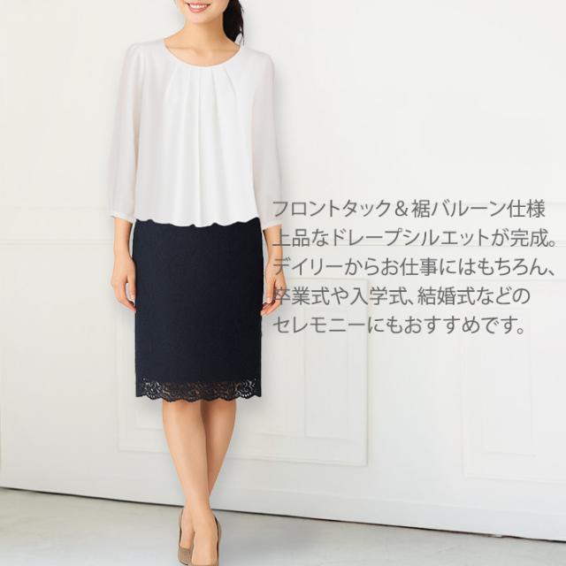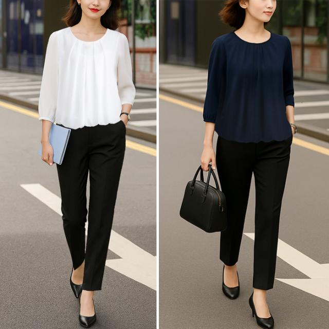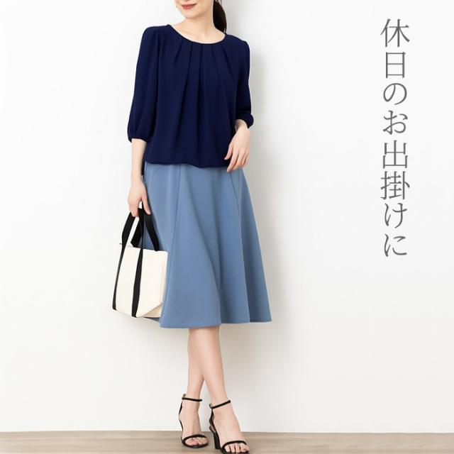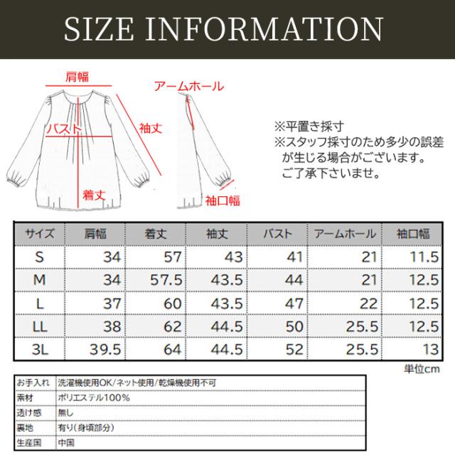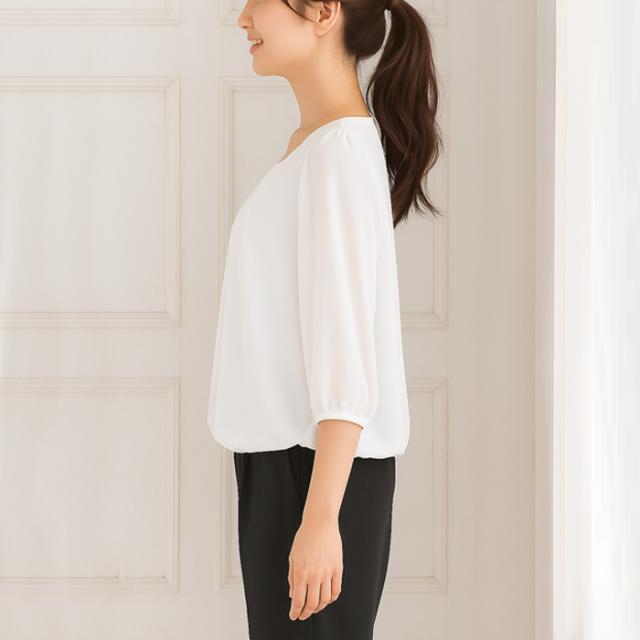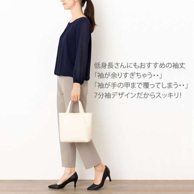 身頃部分は透け防止2枚仕立ての上品ブラウス。普段使いにはもちろん、通勤スーツのインナーやオフィスカジュアルなどのビジネスシーンにも活躍します。