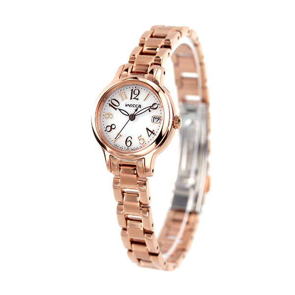 正規品 7年保証キャンペーン 送料無料 シチズン ウィッカ ソーラーテック レディース 腕時計 KH4-963-13 CITIZEN wicca アナログ シルバー×ピンクゴールド ◆ウィッカは旬のカワイイがいっぱい詰まった腕時計ブランドです。フレッシャーズにもぴったりの可愛らしさと視認性を両立した、デイト付きのベーシックなモデルが登場。大きめのアラビア数字インデックスは視認性バツグン。文字板の外周部分にさりげなく描かれたお花のパターンが華やかさを演出します。時分針は夜光付き。暗い場所でも時刻がしっかり確認できます。「素敵なご縁がありますように」と「合格」の2つの意味を込めて、5時位置にさりげなくハートのマークをあしらっています。ベーシックなブラウンと甘すぎないスモーキーピンクはどんな服にも合わせやすく、使い勝手の良いカラーです。 発売日:22年3月発売