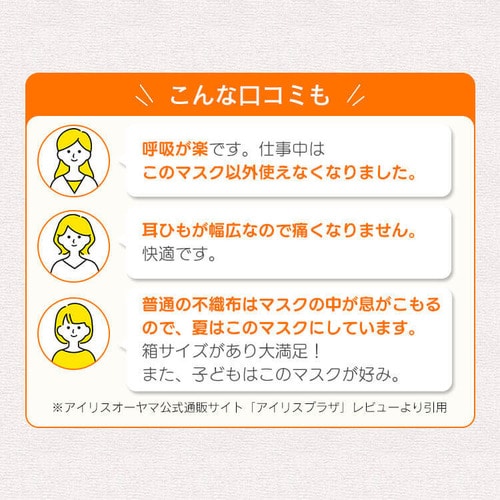 - 一年中愛用してます。ほかのマスクより息が楽です。ただ、ふつうサイズは大きくて小さめは少し小さいのですが、小さめのゴムをのばして使用してます。中間のサイズを作成もしくはゴムをもう少し長めにしてもらえるとありがたいです。