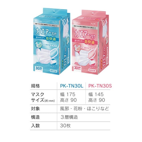 マスク 夏用マスク ナノエアーマスク 30枚入 PK-TN30 ナノエアー マスク ふつう 小さめ 30枚 3層構造 個別包装 個包装 風邪 花粉 ほこり ウイルス飛沫 細菌飛沫 ハウスダスト ワイヤー アイリスオーヤマ