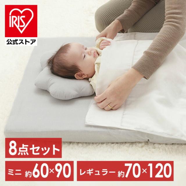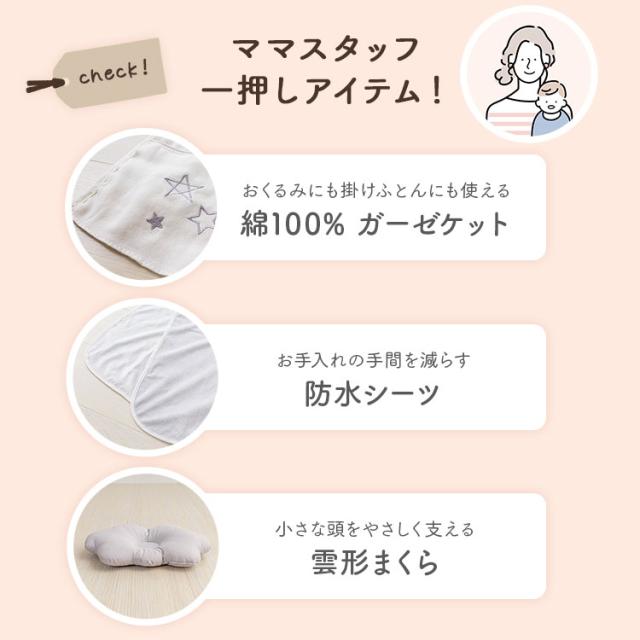 掛けふとん、敷ふとん、枕、掛カバー、フィットシーツ、ガーゼケット、防水シーツ、収納バッグ