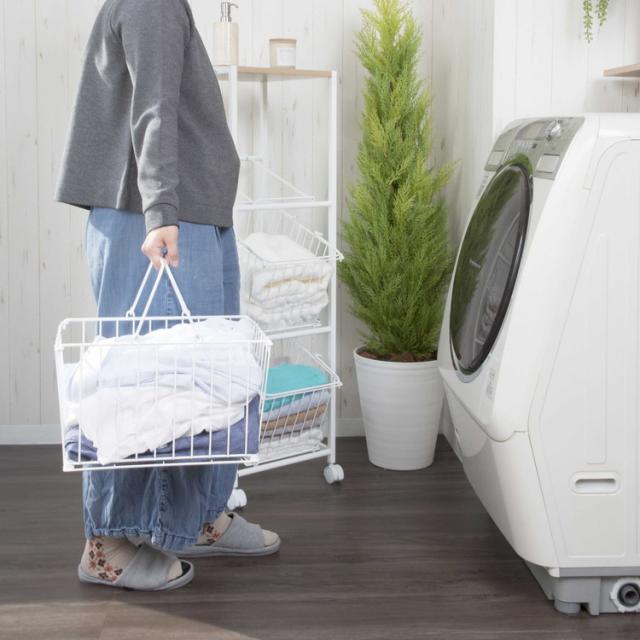 洗濯物を分別できるバスケットは、持ち運びができてとっても便利。斜め設計なので出し入れも簡単。