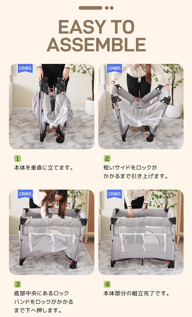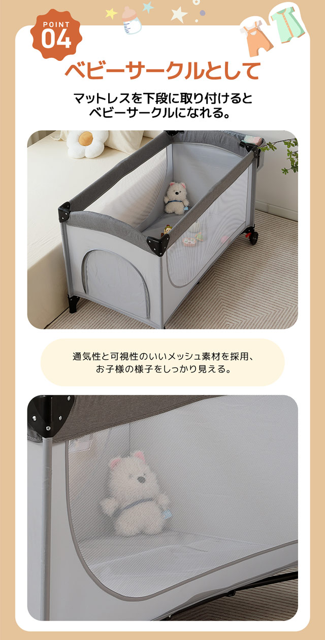 本商品はお昼寝用でけでなく、マットレスを下段に取り付けると、ベビーサークルとしてお使い頂けます。通気性と可視性の良いメッシュ素材を採用していて、家事などをしていても外から中の様子が見えて安心です。
