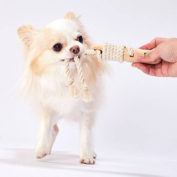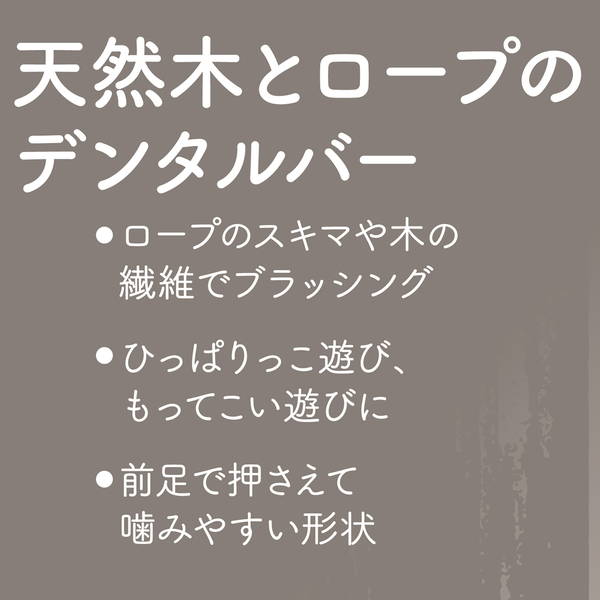 ロープのスキマや木の繊維でブラッシング、ひっぱりっこ遊び、もってこい遊びに、前足で押さえて噛みやすい形状