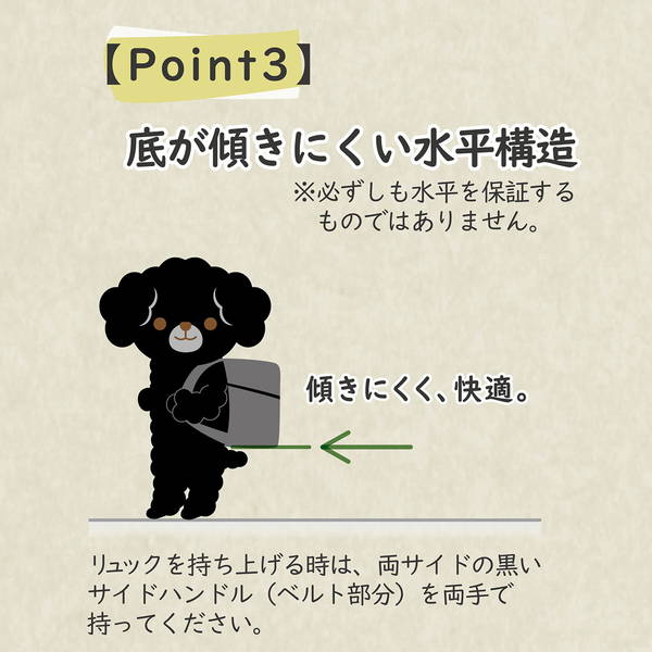 犬にファスナーが接しにくく、閉めやすい。大きく開いてスペース広々。底が傾きにくい水平構造