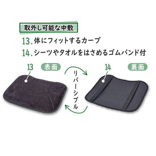 1.ロールアップ可能なメッシュ窓フタ2.通気性の良いサイドメッシュ3.給水器を固定できるファスナー付ポケット4.チェストベルト5.保冷剤等が入るポケット6.シートベルト通し7.両手で持てるサイドハンドル8.ロールアップ可能な幅広メッシュ9.小物用ファスナー付ポケット10.飛び出し防止具11.フックかけに便利なループテープ12.広々使える拡張部13.体にフィットするカーブ14.シーツやタオルをはさめるゴムバンド付