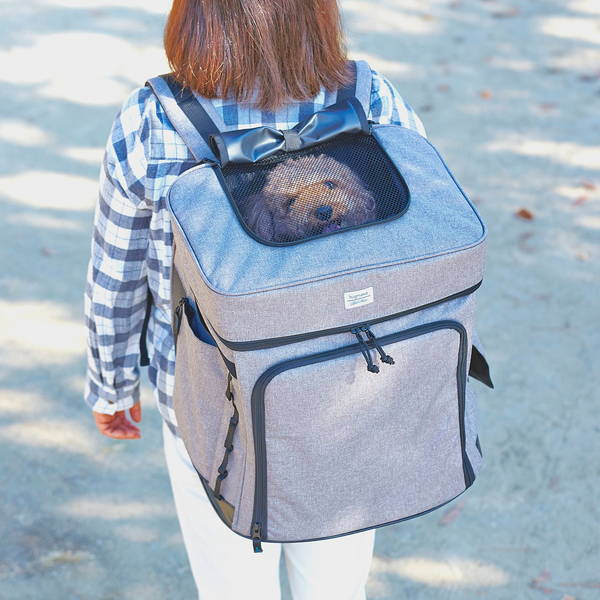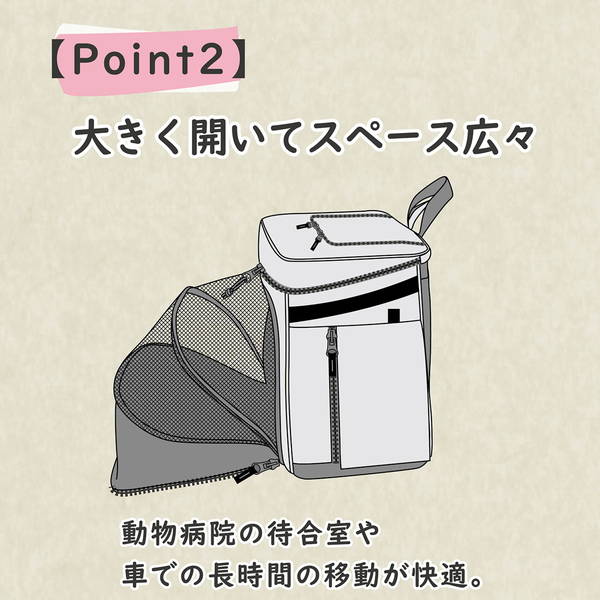 フタが閉めやすく、出先でくつろげるリュックキャリー。動物病院の待合室や車での長時間の移動が快適。