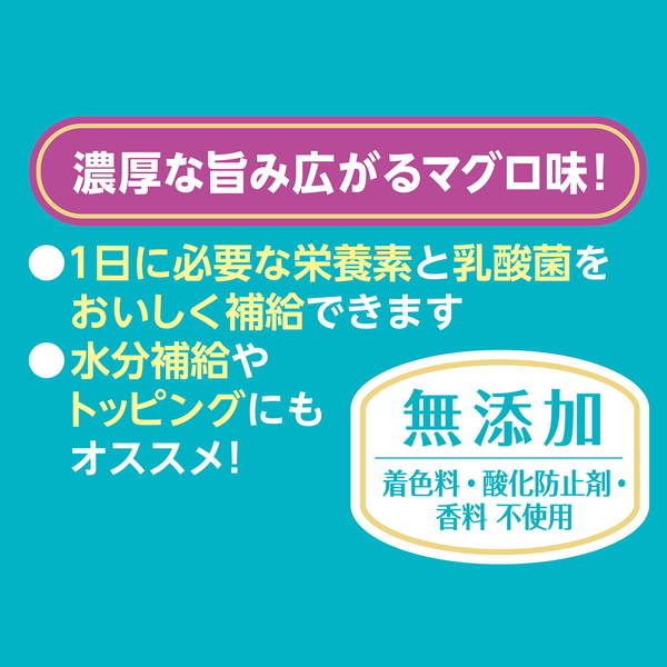 ■原材料|素材:肉類(鶏|鶏レバー|鶏ササミ),鶏脂,まぐろエキス,小麦粉,殺菌乳酸菌(プラズマ乳酸菌),酵母,オリゴ糖,増粘多糖類,ミネラル類(カルシウム|リン|亜鉛|鉄|銅|マンガン|ヨウ素|コバルト|ケイ素|塩素),ビタミン類(A|B1|B2|B6|B12|C|D|E|ナイアシン|パントテン酸|コリン),タウリン,メチオニン