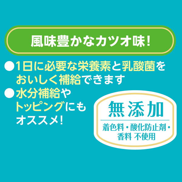 毎日のおやつに乳酸菌プラス。キリンの35年の研究から生まれたプラズマ乳酸菌配合。健康を維持し免疫力を保つ。1日に必要な栄養素と乳酸菌をおいしく補給できる総合栄養食のペースト。トッピングや水分補給にもオススメ!