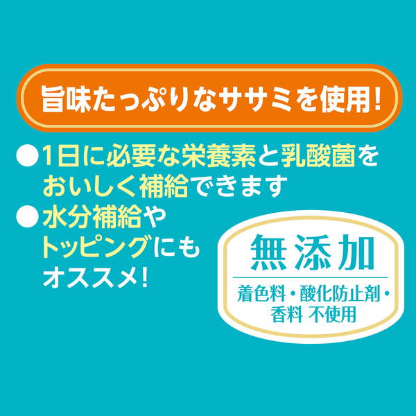 ■原材料|素材:肉類(鶏|鶏レバー|鶏ササミ),鶏脂,まぐろエキス,チキンエキス,食塩,小麦粉,殺菌乳酸菌(プラズマ乳酸菌),酵母,オリゴ糖,増粘多糖類,ミネラル類(カルシウム|リン|亜鉛|鉄|銅|マンガン|ヨウ素|コバルト|ケイ素|塩素),ビタミン類(A|B1|B2|B6|B12|C|D|E|ナイアシン|パントテン酸|コリン),タウリン,メチオニン