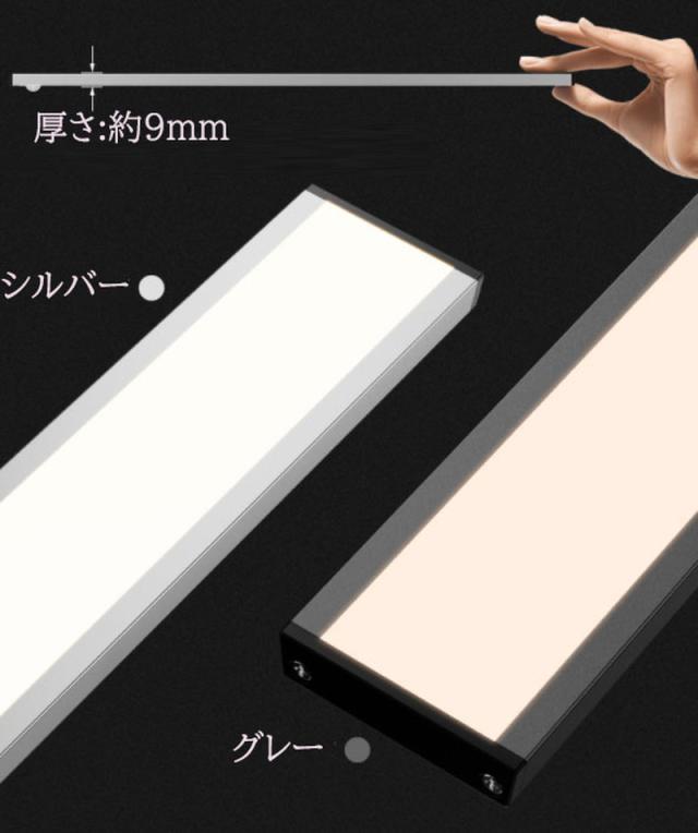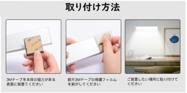 3Mテープ付き、お手軽に貼り付けできます。充電式リチウムイオン電池を内蔵しているので、電池交換の面倒もないし、配線やコンセント接続の必要もありません(USBケーブル付属)
