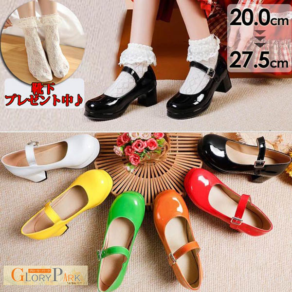 ロリータ靴+靴下プレゼント中 レディースシューズ パンプス メイド靴 可愛い 小さいサイズ 大きいサイズ シューズ ブラック ホワイト レッド グリーン イエロー オレンジ 20.0 27.5 姫様 お嬢様 女の子 おしゃれ 日常 文化祭 イベント 美脚 お茶会 通学