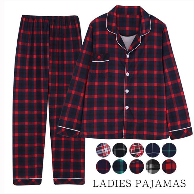 ポイント超超祭 パジャマ レディース 長袖 前開き チェック柄 上下セット 長ズボン 春 秋 ルームウェア 部屋着 母の日 敬老の日 プレゼント 出産祝い