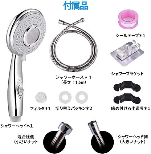 セット内容:シャワー本体×1/シャワーホース 1.5M/シャワーブラケット(パンチフリー)×1/シールテープ×1/切り替えパッキン×2/締め付ける小道具×1
