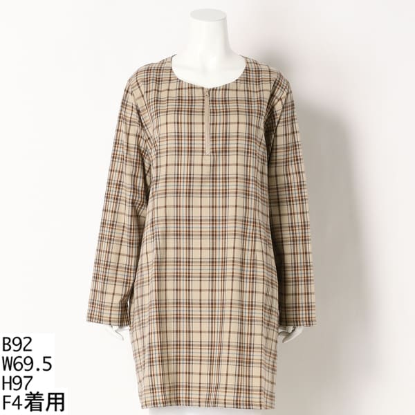 少し起毛した柔らかなコットン素材と、美しいチェックパターン、襟もとに配したファスナーがポイントのチュニックです。