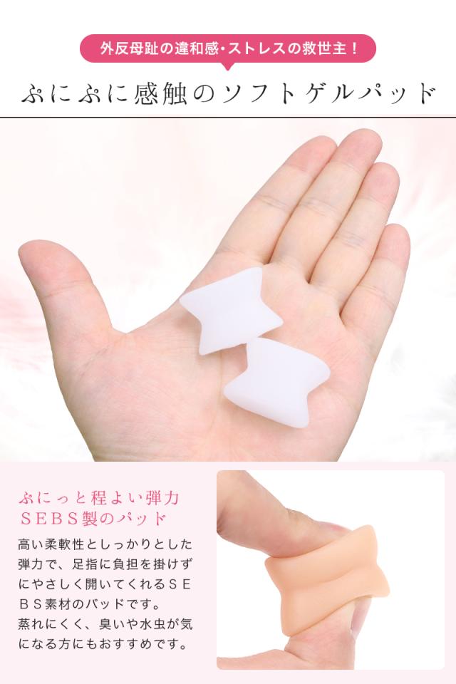 ぷにっと程よい弾力SEBS製のパッド高い柔軟性としっかりとした弾力で、足指に負担を掛けずにやさしく開いてくれるSEBS素材のパッドです。