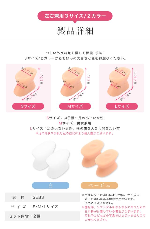 | 商品詳細 | ・カラー:ホワイト/ベージュ ・左右兼用 2個組 ・素材:SEBS ・サイズ:3サイズ Sサイズ【お子様〜足の小さい女性】 Mサイズ【男女兼用】 Lサイズ【足の大きい男性、指の間を大きく開きたい方】 〇ぷにっと程よい弾力SEBS製のパッド 〇親指と人差し指との間をグッと開きます 〇小指側にSサイズをはめれば内反小趾対策に 〇使った後は水洗いで衛生的 |