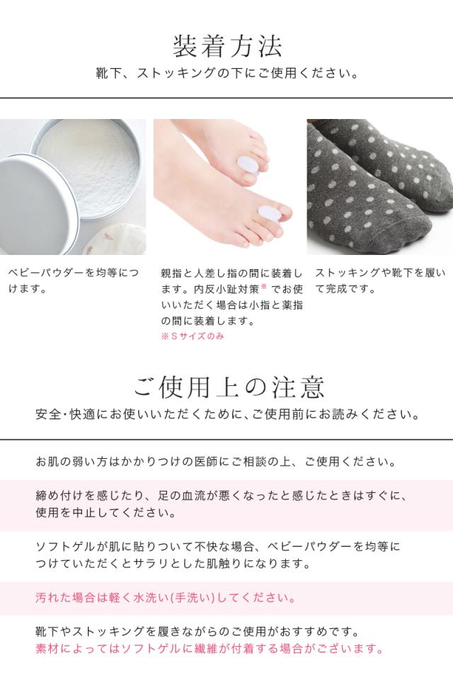 | 注意事項 | ※お肌の弱い方はかかりつけの医師にご相談の上、ご使用ください。 ※締め付けを感じたり、足の血流が悪くなったと感じたときはすぐに、 使用を中止してください。 ※ソフトゲルが肌に貼りついて不快な場合、ベビーパウダーを均等に つけていただくとサラリとした肌触りになります。 ※汚れた場合は軽く水洗い(手洗い)してください。 ※靴下やストッキングを履きながらのご使用がおすすめです。 ※素材によってはソフトゲルに繊維が付着する場合がございます。 |