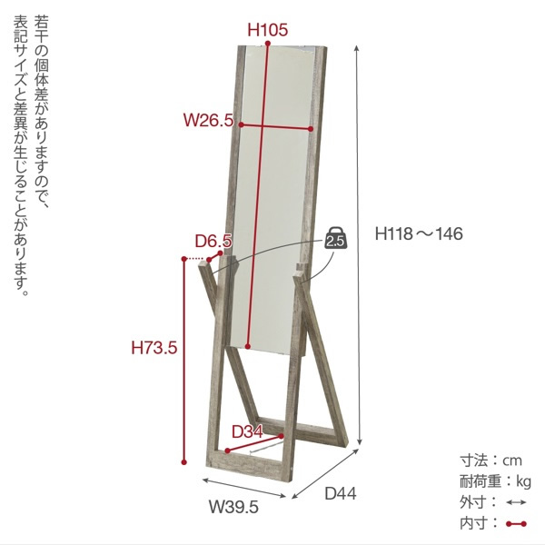 | 商品サイズ | [外寸]幅39.5×奥行44×高さ118〜146cm、[内寸](ミラー)幅26.5×高さ105cm、(フック)出幅6.5×高さ73.5cm、(脚間)奥行36cm |