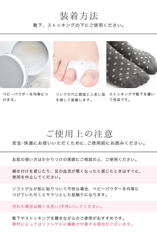※お肌の弱い方はかかりつけの医師にご相談の上、ご使用ください。 ※締め付けを感じたり、足の血流が悪くなったと感じたときはすぐに、 使用を中止してください。 ※ソフトゲルが肌に貼りついて不快な場合、ベビーパウダーを均等に つけていただくとサラリとした肌触りになります。 ※汚れた場合は軽く水洗い(手洗い)してください。 ※靴下やストッキングを履きながらのご使用がおすすめです。 素材によってはソフトゲルに繊維が付着する場合がございます。 |