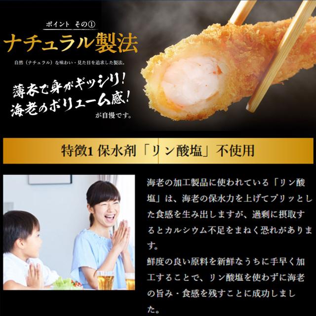 原材料:えび(ベトナム)、衣(パン粉、小麦粉、コーンスターチ、食塩、植物油脂、小麦グルテン)/加工でん粉、増粘剤(グァーガム)、調味料(アミノ酸)、(一部にえび・小麦を含む)