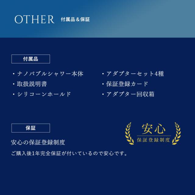 | 商品説明 | ●ウルトラファインバブル機能搭載のシャワーヘッド ●見た目に美しいクロムメッキコーティング ●手元で簡単に一時止水可能なストップ機能付き ●散水板穴数239個で浴び心地抜群 ●節水型超精密散水板使用のため最大50%節水可能 ●適用流量:毎分8〜12リットル ●工具不要!簡単取り付け! ●各社のネジ穴に合わせた4種類のアダプター付き ※バランス釜にはご使用いただけません ※この商品は、2023年4月5日よりカラー追加しております(ゴールド色追加) |