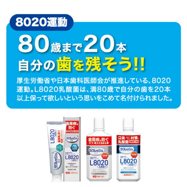 | 商品説明 | ●健康な虫歯のない人の口腔内から見つけたL8020乳酸菌使用 ●歯茎にとどまりやすい「とろみ」処方 ●アルコールを含まない低刺激タイプ ●歯周病予防 ●歯石沈着予防 ●殺菌剤不使用 ●医薬部外品 ●アップルミント風味 ●280ml×2本でのお届け |