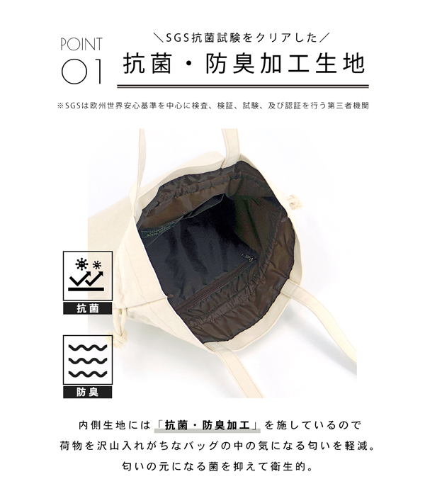 バッグの内側には「抗菌・防臭加工」を施しているので気になるニオイを軽減。