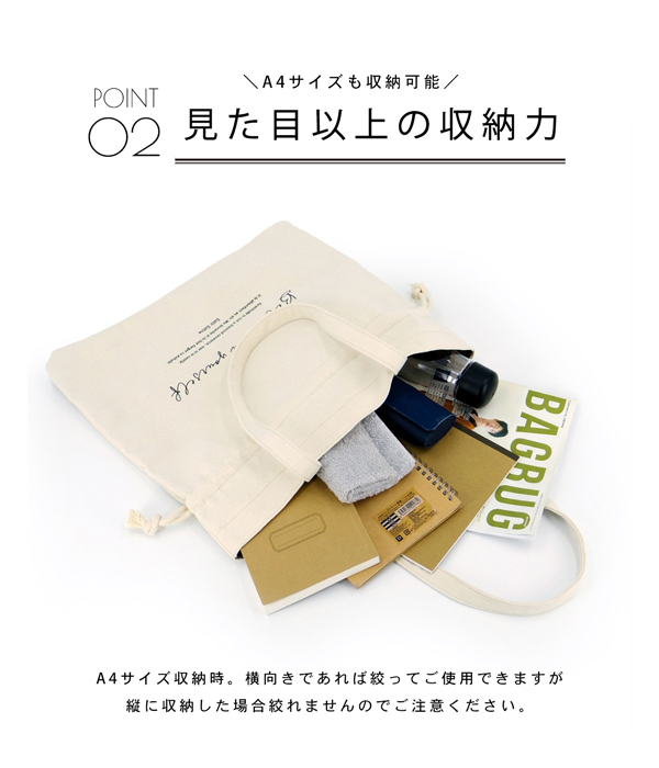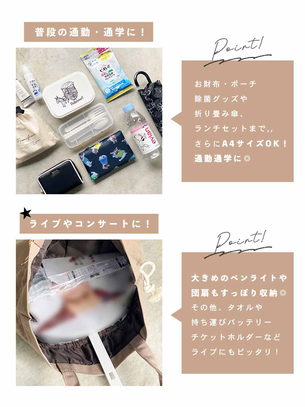 お財布やお弁当、折り畳み傘などを入れて通勤や通学などに使うのはもちろん、