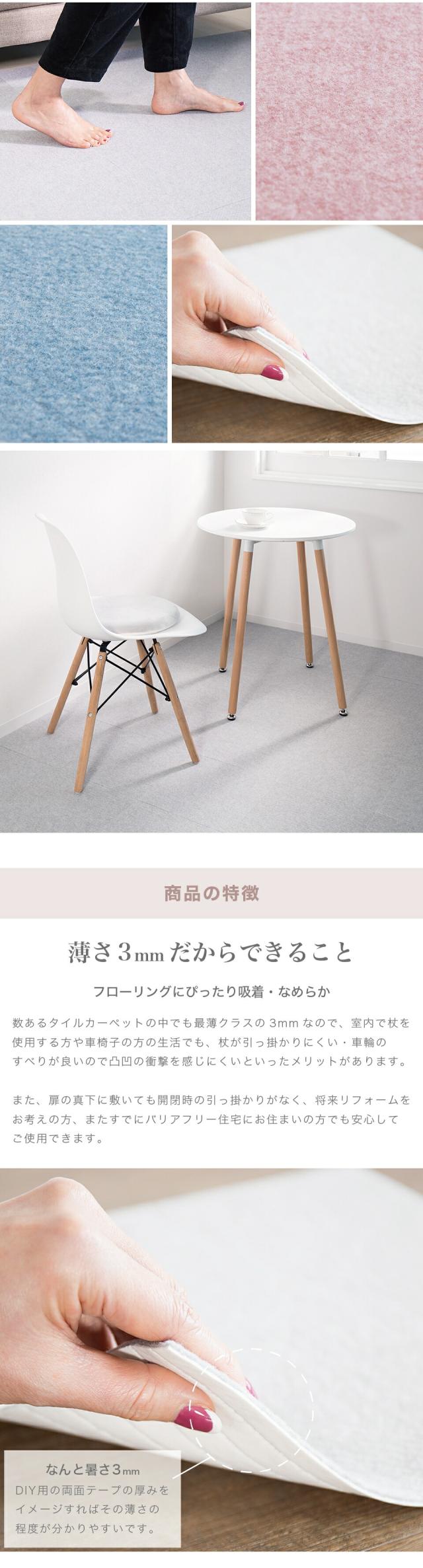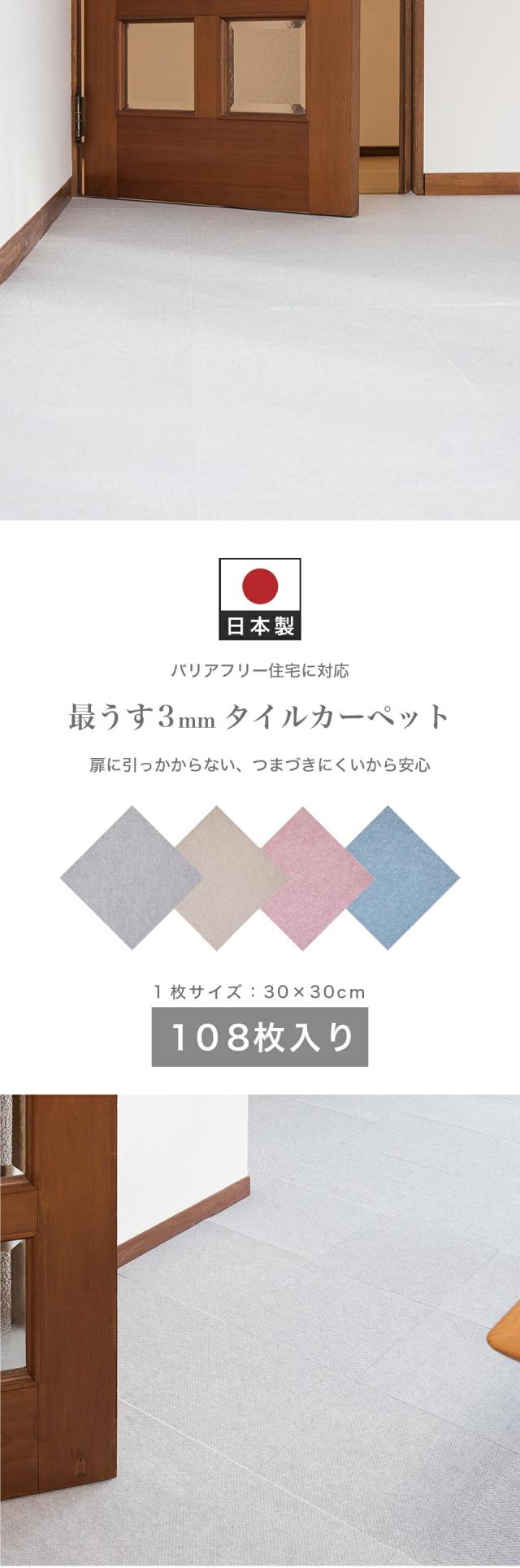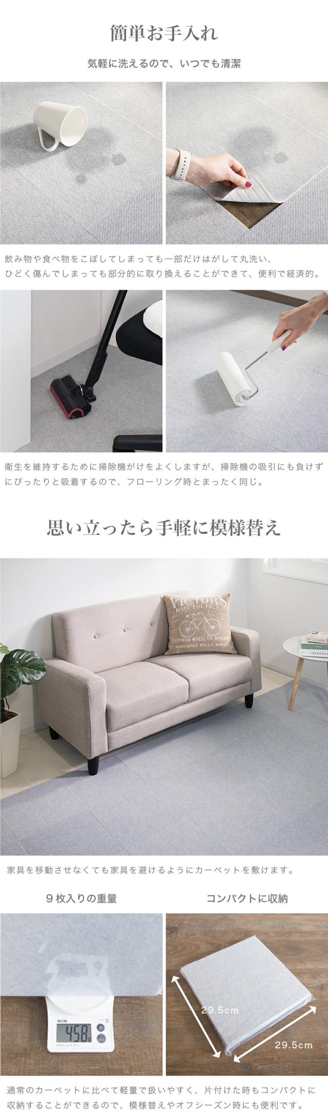 ■商品説明セット内容:108枚入り裏面は特殊吸着加工で床にピタッと吸着。簡単に外せて跡も残りません。目に見えない無数の気孔があり上から力が加わると空気が抜けて真空状態になります。それが無数の吸盤となり、くっつく仕組みです。吸盤の様にピッタリ貼り付き、掃除機で吸い込んでも、犬が走り回ってもめくれず、つまづきにくく安全です。床にキズがつきにくく、掃除もラクラク。汚れた部分だけ外して洗濯機で洗えます。ウォッシャブル 防音対策 キズ防止 滑り防止 ※床暖房には対応しておりませんのでご了承ください。北欧好きやDIY好きにもオススメ!一人暮らし・ファミリー・子供部屋からオフィスまで新生活におすすめの高品質でおしゃれな家具・インテリア・生活雑貨の通販サイト、家具ドキッ!です!!なるべくお求めやすくご提供するために、工場出荷(ファクトリーアウトレットシステム)でのお届けを導入しています。■商品仕様表面 / ポリエステル裏面 / アクリル樹脂 日本製 日本産 国産 ■商品サイズ約29.5×29.5cm■色グレー グレージュ ブルー ローズ レッド ピンク 赤 青 ベージュ 濃ベージュ 濃グレー 濃ブルー 濃ローズ 淡ベージュ 淡グレー 淡ブルー 淡ローズ タイルマット ベージュ 洗える 丸洗い タイルマット 29×29 29.5×29.5 30×30 吸着 タイルカーペット タイルカーペット 29.5 29 30 タイルカーペット 洗える フリーカット 貼り替え リフォーム ラグ 滑り止め 絨毯 洗える 丸洗い オールシーズン キッチンマット ペット カット 置くだけ 防音 吸着カーペット 吸着マット 使い捨て トイレマット 廊下敷き 無地 剥がせる 貼り替え 夏用 冬用 業務用 洗える カーペット 防音 セット 吸着 タイルカーペット ペット タイルカーペット タイルマット 大判 おくだけで吸着タイルマット おくだけタイルマット セット売り 送料無料 1畳 1.5畳 2畳 3畳 4畳 4.5畳 4畳半 4畳用 4 5 畳 5畳 6畳 8畳 10畳 12畳 1帖 1.5帖 2帖 3帖 4帖 4.5帖 4帖半 4帖用 4 5 帖 5帖 6帖 8帖 10帖 12帖 一畳 二畳 三畳 四畳 四畳半 五畳 六畳 八畳 十畳 十二畳 一帖 二帖 三帖 四帖 四帖半 五帖 六帖 八帖 十帖 十二帖 5cm 40cm 80cm 100×100 100×140 130×185 140×140 150×150 160×200 180×180 180×240 182cm 185×185 185×240 190×190 200×200 200×240 200×250 200×300 230×330 240×240 240×300 250×200 250×250 250×350 261×261 261×352 300×250 300×300