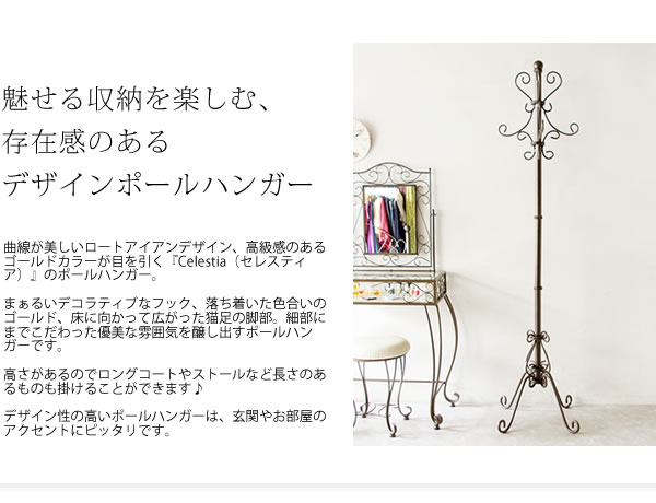 曲線が美しいロートアイアンデザイン、高級感のあるゴールドカラーが目を引く『celestia(セレスティア)』のポールハンガー。